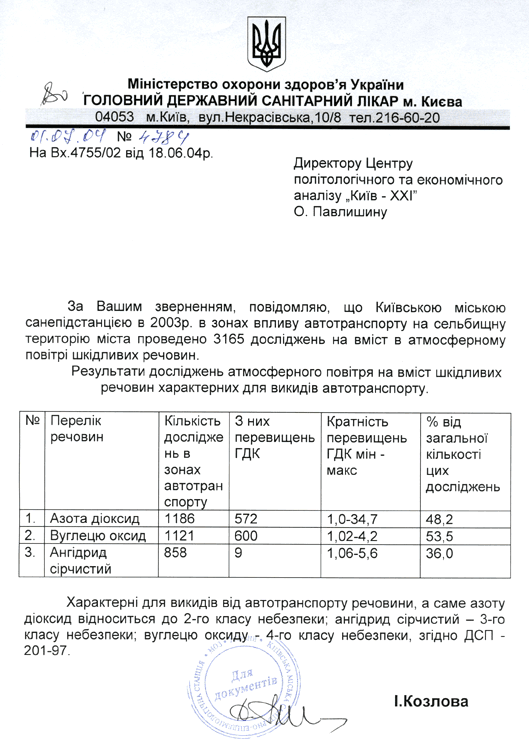 Але навіть з цієї відповіді абсолютно зрозуміло, що висновок ВГО “Громадський контроль” та ЦПЕА “Київ – XXI” про те, що забруднення атмосферного повітря шкідливими сполуками, які містяться у викидах з вихлопними газами автотранспорту, становить серйозну небезпеку для здоров’я та життя киян, є беззаперечним. Зокрема, наведені у листі дані свідчать: