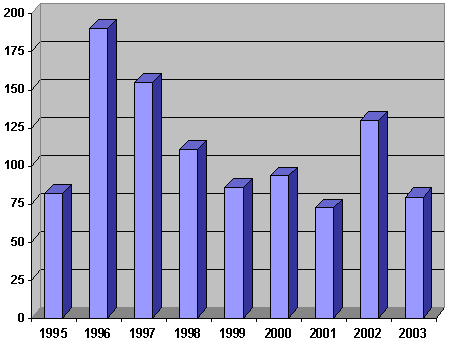 Як бачимо, пік приватизаційних процесів в Тернопільській області припав на 1996 рік - свою форму власності змінили 190 об'єктів нерухомості нежитлового призначення. Однак вже починаючи з 1997 року намітилися тенденції до зниження темпів приватизації. Кількість роздержавлених об'єктів з року в рік скорочувалась. І це зрозуміло, адже саме в цей період набуває значного розвитку вторинний ринок, який суттєво впливає на розміри попиту і пропозиції, 'їх структуру, а також рівень цін на первинному ринку. Період з 1999 по 2001 рік ситуація була доволі стабільною, кількість приватизованих об'єктів з кожним роком відрізнялась не суттєво. Проте вже наприкінці зазначеного періоду на первинному ринку намітилось деяке пожвавлення, що значною мірою пов'язують із зняттям заборони на приватизацію об'єктів в центральній частині міста, для будівель, які є архітектурними пам'ятками місцевого значення Ще в перших місяцях 2002 року було приватизовано близько 70 об'єктів, а до кінця року їх кількість сягнула 129-ти. Однак, вже в наступному році активність на даному сегменті ринку нерухомості знову знизилась і сягнула рівня 2001 року. Так, в 2003 році в Тернополі було приватизовано близько 18000 м 2, а це 72 об'єкти нерухомості, що на 44% менше, аніж в попередньому році Щоправда, очікується, що в поточному році їх кількість буде більшою, адже на сьогоднішній день до приватизації вже підготовлено 33 об'єкти, а всього планується, що свою форму власності змінять 116 об'єктів нерухомості, загальною площею близько 13000 м 2.