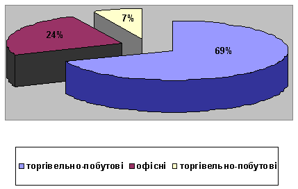 На рис.2 наведено структуру приватизації нежитлової нерухомості за призначенням об'єктів Як бачимо, 69% всіх приватизованих за минулий рік об'єктів становлять власне торгівельно-побутові приміщення, 24% - адміністративні, і лише 7% - виробничо-складські. Таке співвідношення яскраво відображає ситуацію на первинному ринку нерухомості. Дійсно, у структурі пропозиції явно переважають торгово-побутові та офісні приміщення, в той час як частка приміщень виробничо-складського призначення є доволі низькою. Чим це пояснюється? Перш за все тим, що на первинному ринку Тернополя кількість подібної нерухомості є доволі обмеженою, що не задовольняє постійно зростаючий попит на них. Головним чином, це приміщення недіючих підприємств, що залишилися ще з радянських часів, які, до речі, вже практично повністю освоєні більшість з них давно приватизовані, а та невелика кількість, що ще не приватизована здається в оренду і, як правило, з правом викупу. І хоча стан їх залишає бажати кращого, а деякі з них не підходять для професійного використання, оскільки їм не вистачає основних атрибутів, таких як навантажувальні платформи і належні заходи безпеки, все ж і вони знаходять свого споживача, для якого ціновий фактор залишається головним. Що стосується будівництва на цьому сегменті нерухомості, то зазначимо, що воно вимагає великих витрат, а це, враховуючи значно нижчі ціни пропозиції аналогічних об'єктів, є невиправданим. Зазначимо, що вартість приватизації 1 кв.м. виробничо-складських площ складає 22-35 у.о/м 2, в залежності від розташування, розміру та технічного стану об'єкту, в той час як вартість нового будівництва аналогічних об'єктів обійшлася б споживачеві приблизно в 60-100 у.о./м 2.