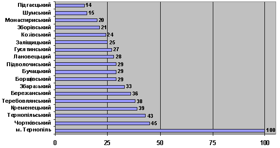 В процесі вказаного дослідження, нами була обрана 10-ти бальна система оцінювання величини показника, причому максимальне значення присвоювалось обласному центру. Далі, кожен район отримував відповідну кількість балів, в залежності від того, якому діапазону значень відповідала величина його показника. Після оцінки всіх обраних нами статистичних показників для кожного із районів, набрані ним бали сумувались та на основі співвідношення їх до Тернополя визначався, так званий, коефіцієнт "розриву" для окремо взятого регіону.